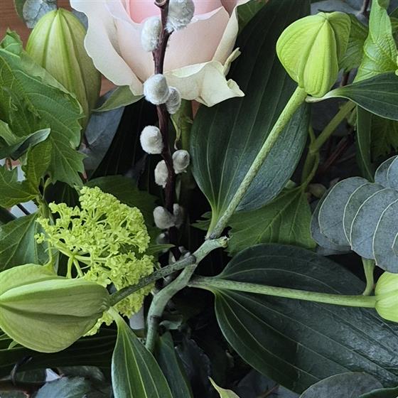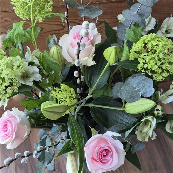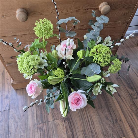Our bouquet of the month for March is simple and elegant and includes the wonderful Viburnum Roseum, Pussy Willow, Eucalyptus and, either pink or white Lilies, Roses and Alstromeria. The colour will depend on what we have in stock on the day. Order as a hand tie and the stems will all be lovely and long, perfect for a taller vase, also available as an aqua pack.